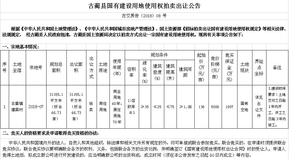 古藺縣國有建設用地使用權拍賣出讓公告
